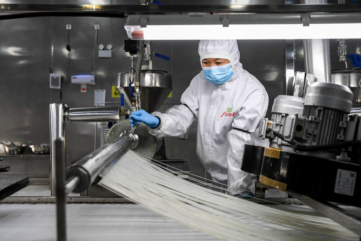 在廣西柳州市一家螺螄粉生產企業(yè),工作人員在查看米粉的生產情況(2024年12月13日攝)。新華社記者 曹祎銘 攝