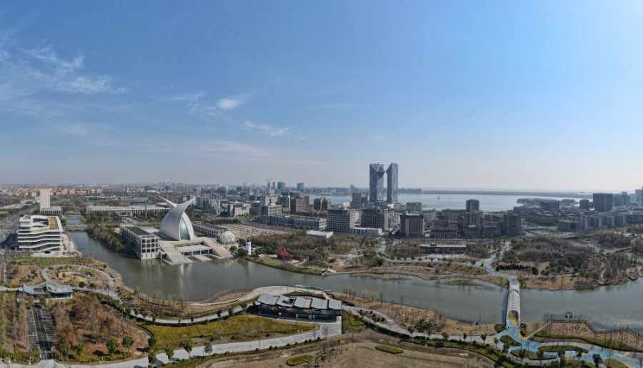 這是2025年3月19日拍攝的上海自貿(mào)試驗(yàn)區(qū)臨港新片區(qū)滴水湖畔景色(無(wú)人機(jī)照片)。新華社記者 方喆 攝