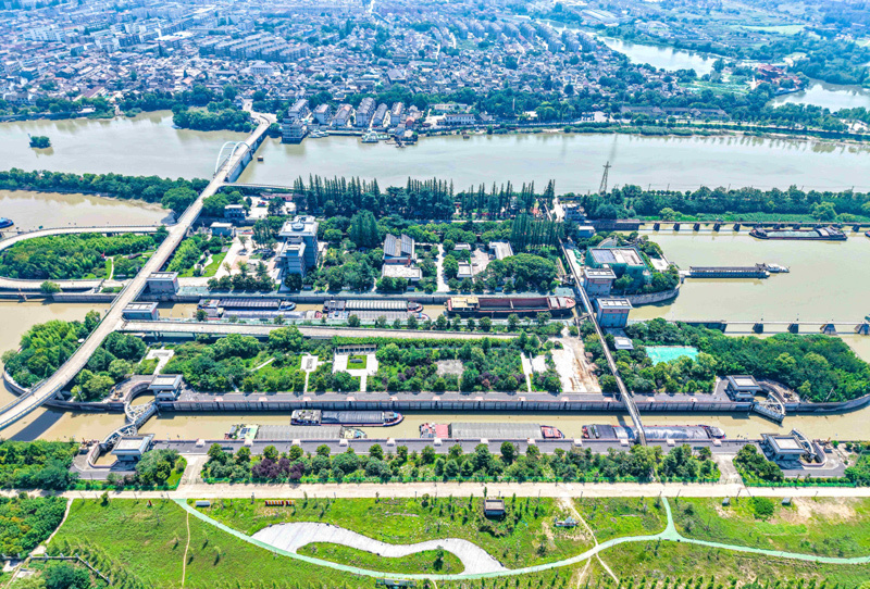 2025年7月4日,船舶有序通過京杭大運河揚州段邵伯船閘(無人機(jī)照片)。新華社發(fā)(任飛 攝)