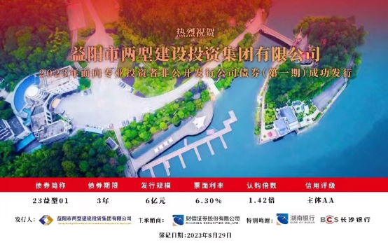 2023年8月29日,益陽(yáng)市兩型建設(shè)投資集團(tuán)有限公司成功發(fā)行“2023 年面向?qū)I(yè)投資者非公開(kāi)發(fā)行公司債券(第一期)”,發(fā)行規(guī)模6億元,期限3年,票面利率6.30%。此次公司債券的成功發(fā)行,充分體現(xiàn)了資本市場(chǎng)和投資者對(duì)益陽(yáng)市兩型投集團(tuán)經(jīng)營(yíng)狀況、發(fā)展前景的高度認(rèn)可。下一步,益陽(yáng)市兩型投集團(tuán)將繼續(xù)發(fā)揮直接融資的優(yōu)勢(shì),加快推進(jìn)各項(xiàng)融資工作,為集團(tuán)項(xiàng)目高標(biāo)準(zhǔn)建設(shè)提供有力資金支持,進(jìn)一步推動(dòng)集團(tuán)全方位高質(zhì)量發(fā)展。