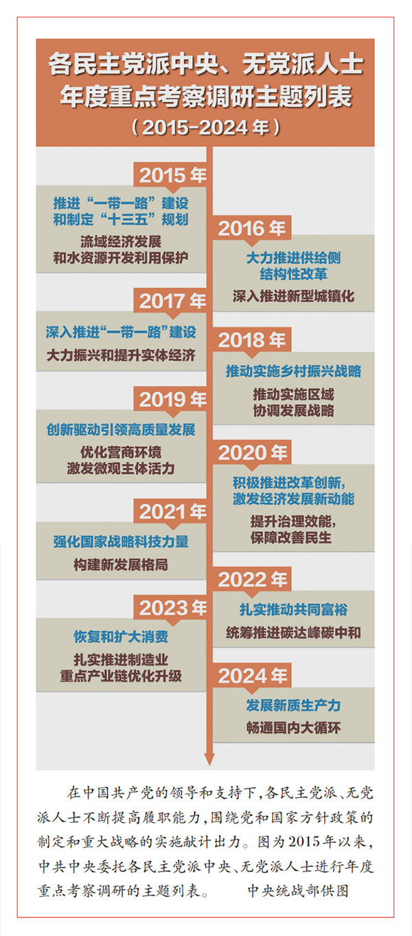 八是明確更好體現(xiàn)中國(guó)新型政黨制度效能的著力點(diǎn)是發(fā)揮好民主黨派和無(wú)黨派人士的積極作用。習(xí)近平總書記著眼以中國(guó)式現(xiàn)代化全面推進(jìn)強(qiáng)國(guó)建設(shè)、民族復(fù)興偉業(yè),強(qiáng)調(diào)希望各民主黨派把多黨合作所長(zhǎng)與中心大局所需結(jié)合起來(lái),在參政議政中聚眾智,在民主監(jiān)督中建諍言,在政黨協(xié)商中獻(xiàn)良策;強(qiáng)調(diào)用好政黨協(xié)商這個(gè)民主形式和制度渠道,有事多商量、有事好商量、有事會(huì)商量,通過協(xié)商凝聚共識(shí)、凝聚智慧、凝聚力量。這些重要論述,明確了各民主黨派和無(wú)黨派人士發(fā)揮作用的著力點(diǎn),為更好體現(xiàn)中國(guó)新型政黨制度效能指明了實(shí)踐路徑。