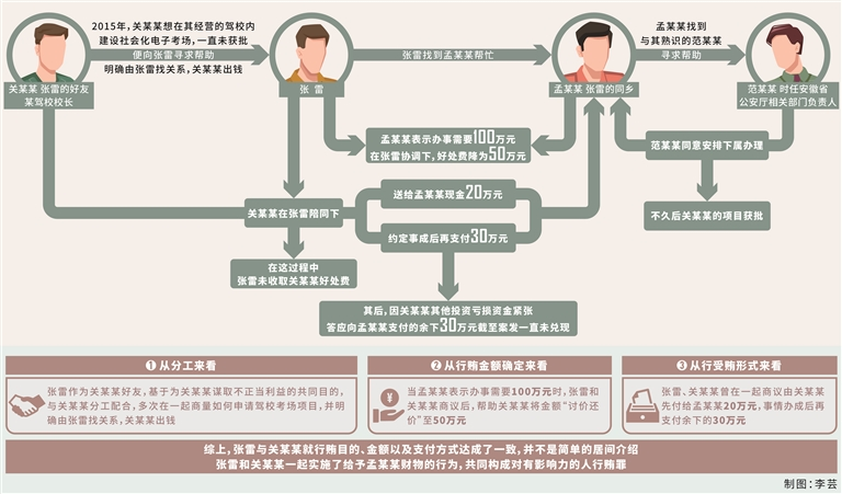本案中,張雷雖然在關某某、孟某某之間牽線搭橋,但其所起的作用遠不止中間人的角色,而是與關某某之間存在行賄通謀的行為。從分工來看,張雷、關某某多次在一起商量如何申請駕校考場項目,并明確由張雷找關系,關某某出錢。從行賄金額確定來看,當孟某某表示事情不好辦時,張雷和關某某商議后,幫助關某某將金額“討價還價”為50萬元。從行受賄形式來看,張雷、關某某曾在一起商議由關某某先付給孟某某20萬元,事情辦成后再支付剩余的30萬元?梢姡瑥埨着c關某某就行賄目的、金額以及支付方式達成了一致,并不是簡單的居間介紹?梢哉f,張雷和關某某通過各自的行為,為實現(xiàn)駕?紙鲰椖康膶徟,共同實施了給予孟某某財物的行為,應當認定構成共同犯罪。