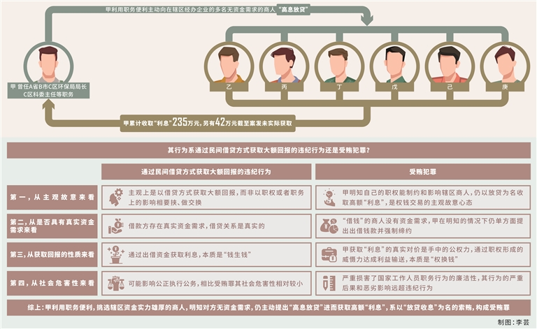 綜上,甲利用其擔任C區(qū)環(huán)保局局長以及C區(qū)科委主任等職務上的便利,挑選在C區(qū)經(jīng)辦生產(chǎn)型企業(yè)且資金實力雄厚的商人,明知對方無資金需求,仍主動提出出借錢款并約定高額利率,進而獲取高額“利息”,系以“放貸收息”為名的索賄,構成受賄罪。