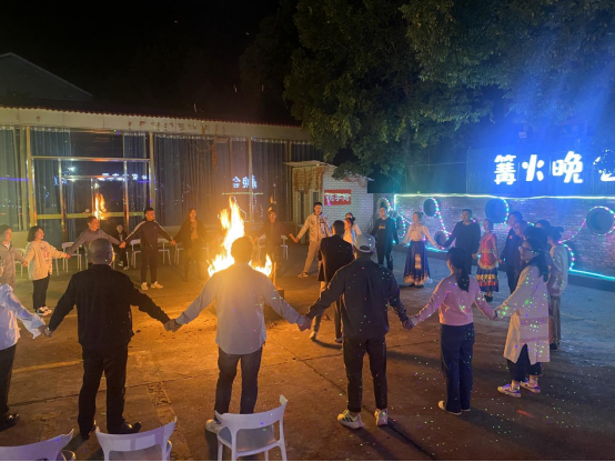 夜幕降臨,大家搬好桌椅、發(fā)放物料,在訓(xùn)練場(chǎng)地中央點(diǎn)燃慶祝的篝火。涼風(fēng)拂過(guò)場(chǎng)地,音響師調(diào)出美妙的音符,大家也按捺不住舞動(dòng)的腳步。